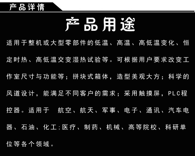 一、用途適用于整機(jī)或大型零部件的低溫、高溫、高低溫變化、恒定時熱、高低溫交變濕熱試驗(yàn)等。可根據(jù)用戶要求改變工作室尺寸與功能等;拼塊式箱體,造型美觀大方;科學(xué)的風(fēng)道設(shè)計(jì),能滿足不同客戶的需求;采用觸摸屏,PLC程控器。適用于 航空、航天、軍事、電子、通訊、汽車、電器、石油、化工;醫(yī)療、制藥、機(jī)械、高等院校、科研單位等各個領(lǐng)域; 二、壓縮機(jī):1,采用法國泰康全密閉式壓縮機(jī)或德國比澤爾半密閉式壓縮機(jī)(保證機(jī)器性能可靠性)2,冷媒R22 + R23(環(huán)保型,臭氧耗損指數(shù)均為0)3,制冷系統(tǒng)的制冷量調(diào)節(jié)、氣液旁路調(diào)節(jié)、蒸發(fā)溫度調(diào)節(jié)等,在任何低溫溫度點(diǎn)恒溫時,無需加熱平衡,運(yùn)行功率可降低至一半,使制冷系統(tǒng)的運(yùn)行費(fèi)用和故障率下降到較為經(jīng)濟(jì)的狀態(tài)。4,采用智能型自動轉(zhuǎn)換膨脹系統(tǒng),根據(jù)負(fù)載自動調(diào)整冷媒流量+智能型電熱功率數(shù)據(jù)值(%)匹配升降溫(負(fù)載)自動模擬輸出功率數(shù)據(jù)輸出值.此設(shè)計(jì)比傳統(tǒng)設(shè)計(jì)更加省電。