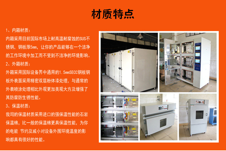 1、中創(chuàng)儀器采用的觸摸屏控制器,外觀大方美觀,控制精度高,穩(wěn)定性能好;其它電控配件均采用進口品牌,使用壽命長,安全性能高,為客戶提供安全放心的設備;2、K型熱電偶溫度傳感器,精度高、感應溫度快、耐高溫、低維護;3、隔熱層采用耐高溫的硅酸鋁棉或巖棉隔熱保溫,設備保溫效果好,擴散溫度少,為客戶用電降低成本;4、采用耐高溫、噪音小、振動小電機,同時應用渦輪型風輪,風壓強風量大,有效的使箱內(nèi)熱風循環(huán)流暢,使溫度均勻性高。